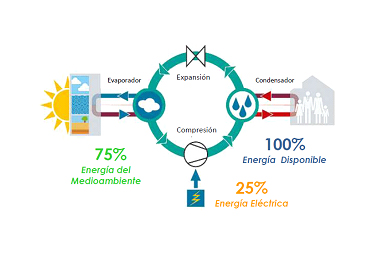 Bombas de calor aerotérmicas (aire-agua)Estos sistemas tienen como principio operativo el concepto de alto rendimiento energético conocido como “recuperación de calor”. Estas bombas, extraen la energía del aire exterior, absorbiendo el calor ambiental y transfiriéndolo al interior del recinto o vivienda, a través de un circuito de distribución o acumulación de agua caliente.