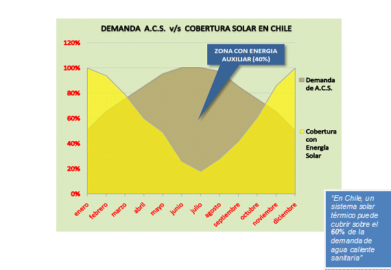 El siguiente gráfico demuestra que es posible satisfacer con creces la necesidad de recursos de una familia chilena promedio, la cual el año anterior demandaba el doble de agua caliente sanitaria. De acuerdo con las estimaciones del mercado, en al menos 6 meses al año, un sistema de energía solar térmico puede cubrir, sobre el 50% de nuestra demanda de agua caliente sanitaria (A.C.S.) y con la tecnología europea que hoy está disponible en Chile, estos sistemas pueden alcanzar tasas de ahorro superiores al 75%.