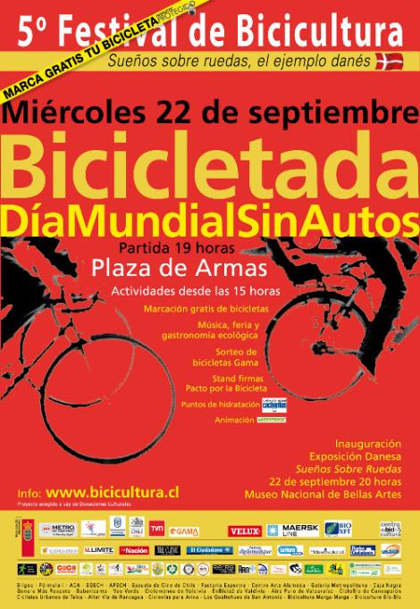 El plato fuerte de este festival está enmarcado en el DÍA MUNDIAL SIN AUTOS, actividad en la cual BICICULTURA y todas las organizaciones pertenecientes al movimiento Ciclistas Unidos de Chile (CUCH), invitan a participar en actividades el día 22 de septiembre, a partir de las 15:00 horas en la Plaza de Armas, y la clásica bicicletada, que partirá desde este mismo lugar a las 19:00 horas con rumbo al Museo de Bellas Artes, en donde se exhibirá gratis la exposición “Sueños Sobre Ruedas”, el ejemplo danés de bicicultura. RECICLETA es una de las organizaciones que se une a esta cruzada, y se hará presente con un stand con información sobre la organización.